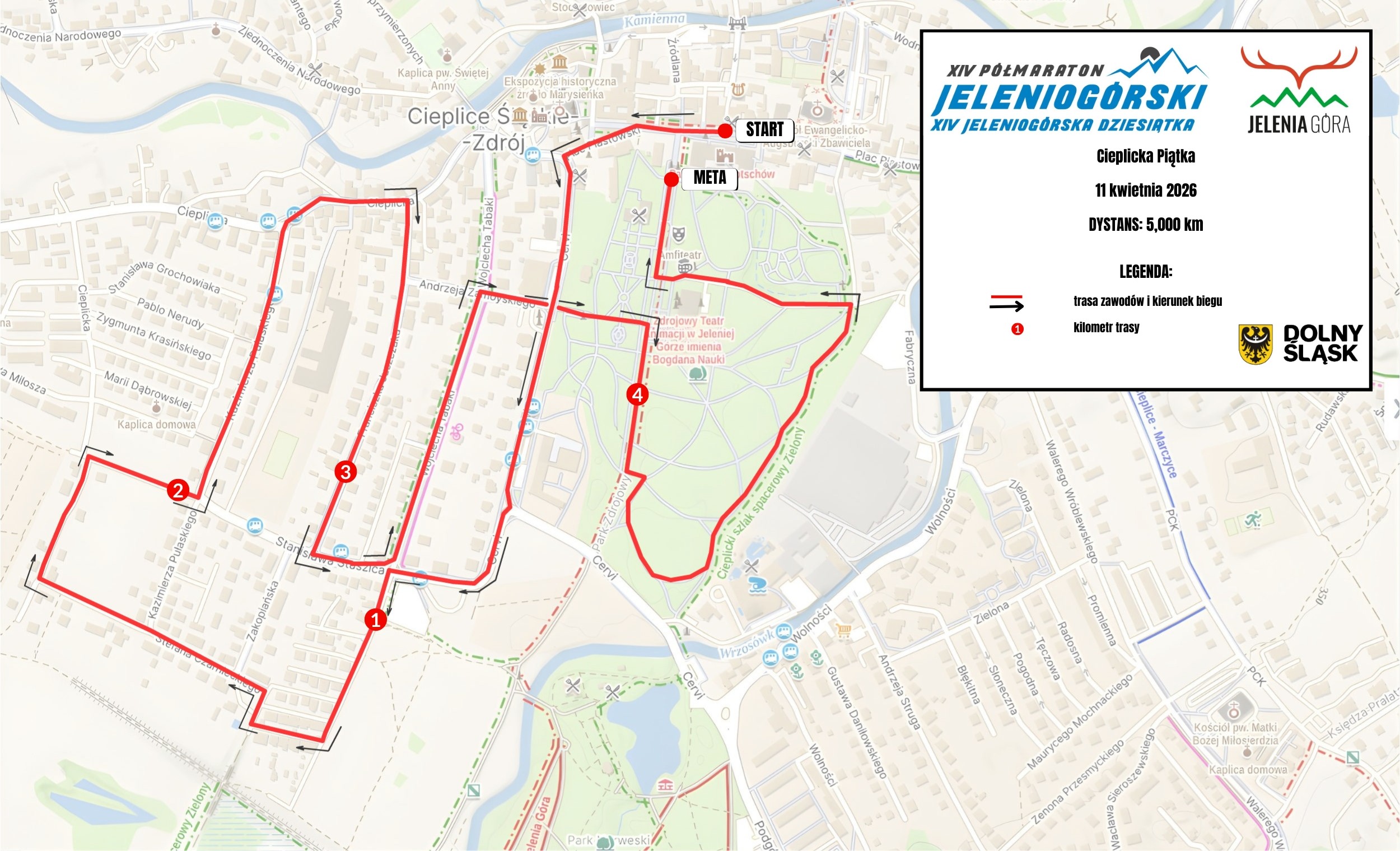 Start (Plac Piastowski) – ul. Cieplicka – ul. Cervi – ul. Staszica – ul. Tabaki – ul. Bilewicza – ul. Czarnieckiego – ul. Juszczaka – ul. Pułaskiego – ul. Cieplica – ul. Juszczaka – ul. Staszica – ul. Tabaki – ul. Zamoyskiego – Park Zdrojowy (Meta)