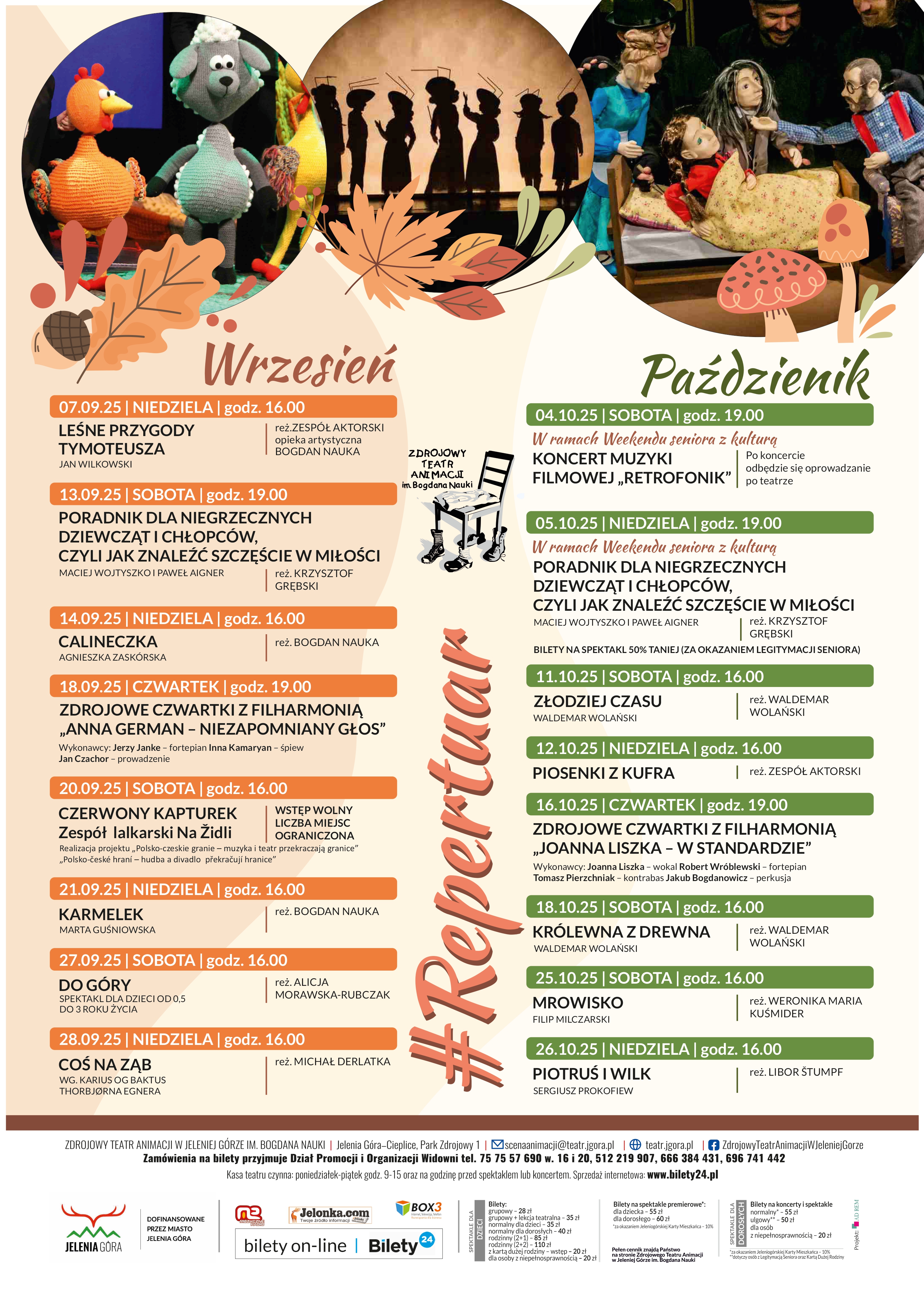 We wrześniu i październiku 2025 roku na widzów czekają spektakle dla najmłodszych, propozycje familijne, koncerty muzyczne oraz spotkania w ramach cyklu Zdrojowe Czwartki z Filharmonią.